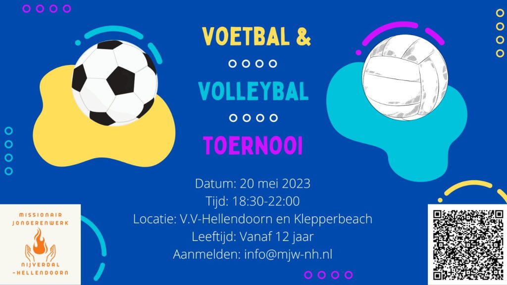 Op zaterdag 20 mei organiseert het missionair jongerenwerk een interkerkelijk voetbal/beachvolleybaltoernooi. Deze zal plaatsvinden op het sportveld van V.V-Hellendoorn en op Klepperbeach. Leeftijd vanaf 12 jaar, maar ben je iets jonger en je wilt heel graag meedoen, ben je natuurlijk van harte welkom. Ook de “oudere jeugd” nodigen we graag uit voor dit evenement.